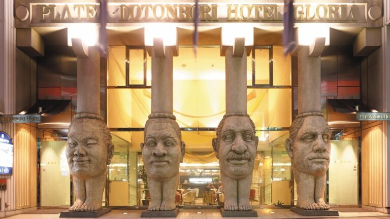 外観の巨大な柱像が印象的で、ホテル前から大阪らしい活気を感じられます。